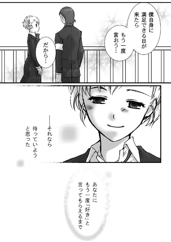 やっと告白……! 「好き」のセリフはゲーム通りの表示にしました。 おそらく彼らの漫画はこれが最後かと思います。 ここまで読んでいただきまして、 本当にありがとうございました! 2011.07.13
