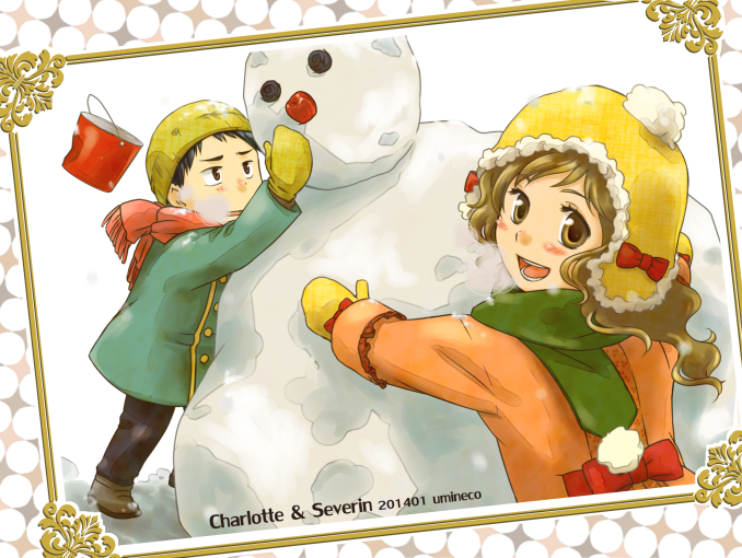 二人のマフラーがちぐはぐなのは交換しているから。
