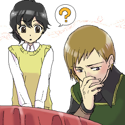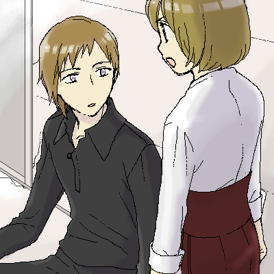 18 ・ フィル 射抜いて傷口えぐりそうなくらいの視線を感じる。 「アシュレイ……言いたいことがあるなら言ってくれ」 今日はいつもの授業になぜかアシュレイもいた。 「フィル君さー……女性恐怖症、治ったの?」 「……は?」 「今朝見ちゃったんだよねえ、マチちゃんとハグし」 「してないっ!」 アシュレイが言い終わる前に否定した。 違う、断じて違う。 あれは……そう、信頼とか感謝とかそういうものだ。うん。 「だいたい、マチはまだ子供だろう」 僕が出来るだけ平静を装って言うと、彼は大げさにため息をついた。 「あのさー、マチちゃんが何歳か知ってる?」 「……そういえば聞いてないな」 「だろうねえ」 そう言ってアシュレイはマチに顔を向ける。 「マチ、君の年齢は?」 アシュレイは彼女が聞き取りやすいようにゆっくりと聞いた。 ……なんとなく嫌な予感がする。 「ねんれい……えーっと、あとすこし、じゅうはち」 「……じゅうはち?18歳?」 「うん」 僕は笑顔で肯定するマチを見ながら、 マチの世界とこちらでは時の流れが違うんだと、必死で思いこもうとした。 |
