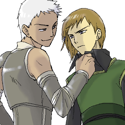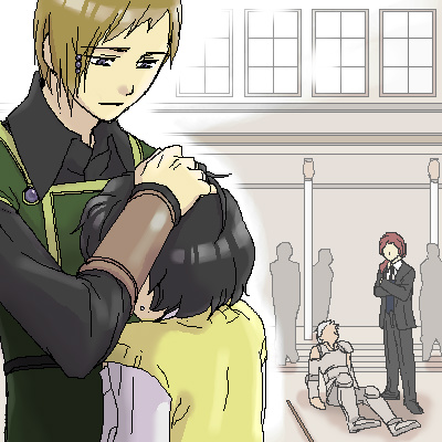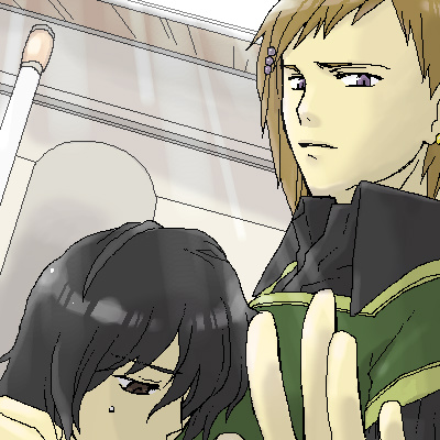 21 ・ マチ 「なんだ、このガキ」 「マ……ルディ、やめなさい」 私はフィルの言葉に答えない。 これはあの朝連の後にした彼との約束でもあった。 フィル達以外の人がいる場では話してはいけない、と。 私がフィルの弟ではないとわかってしまうから。 だから言葉を交わしたりしない、でも剣は下げない。 「ルディ、僕は大丈夫だから。剣を下ろしなさい」 フィルがゆっくりと立ち上がって、私の肩をつかんだ。 鎧姿の男がフィルと私を見比べている。 「なんだ、魔術師サマの弟かなんかか?兄貴と違って威勢だけはいいな」 男は自分に突きつけられた模造刀をつかんだ。 あいている左手を肩の位置に上げる。 「オレにもブツ寄こせ!あと兄貴は動けないように捕まえとけ」 「……!」 模造刀を受け取り、私の頭上でにやりと笑った。 「兄貴のかわりに稽古つけてやるよ」 |